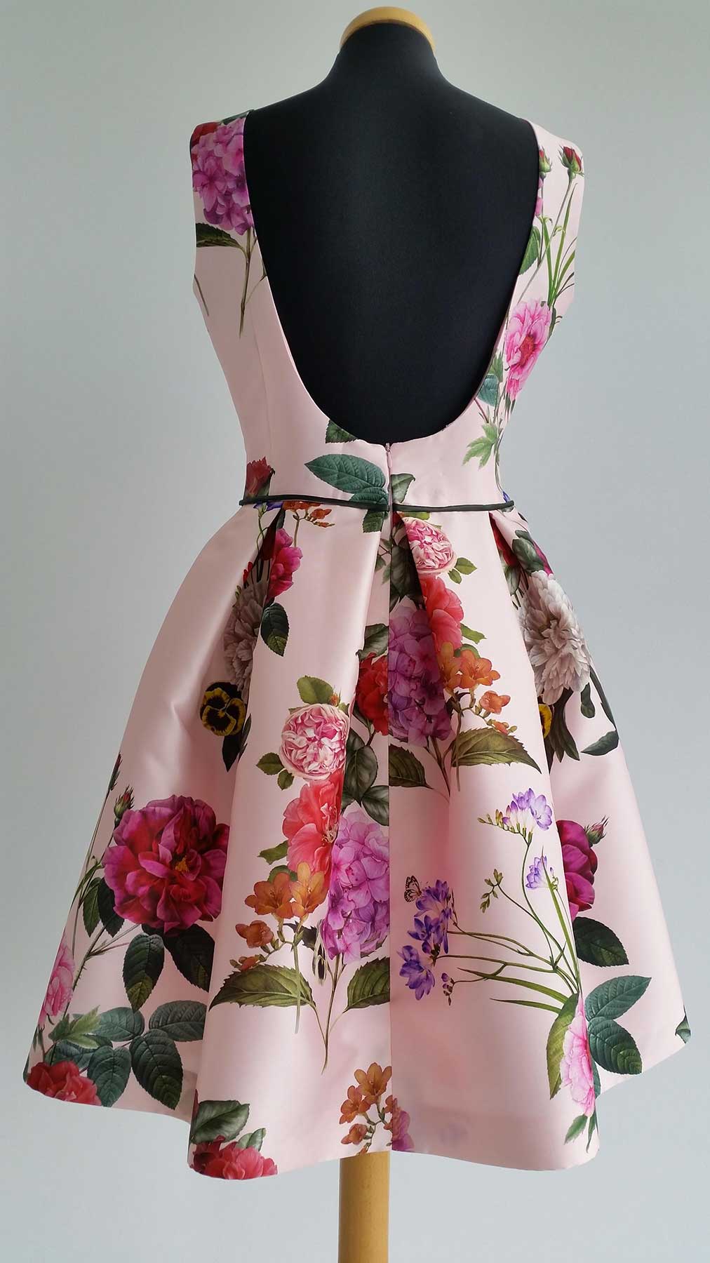 Abito taglio sartoriale con gioco di volumi sulla gonna, realizzato in Mikado di seta pura, digital print con motivi floreali dai colori vivaci.